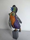 Assemblage matières métalliques, yeux de poupée, peinture, socle stéatite